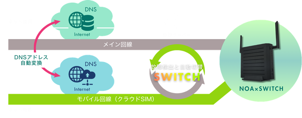 「NOA×SWITCH」は、万が一の回線トラブルを瞬時に検知し、自動で予備ルートへ切り替えるバックアップソリューションです。
